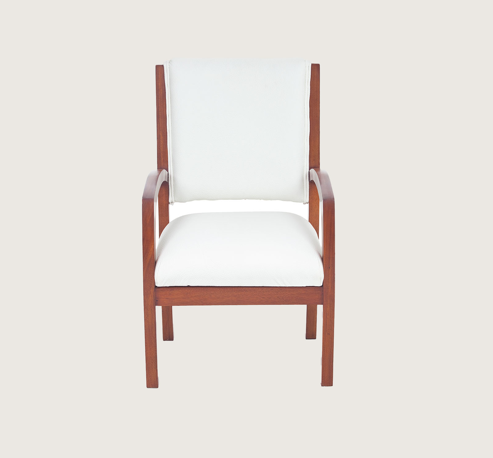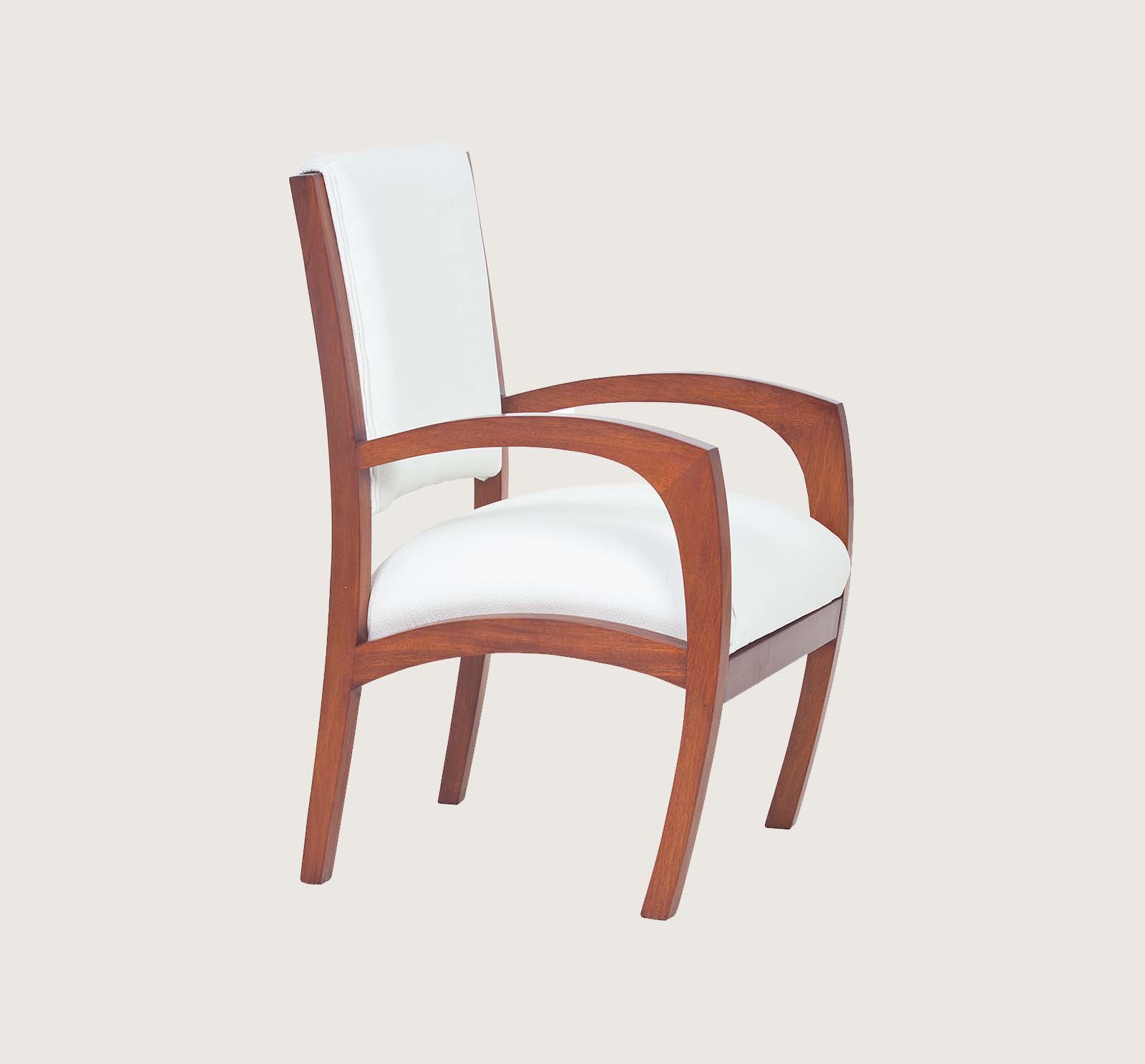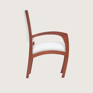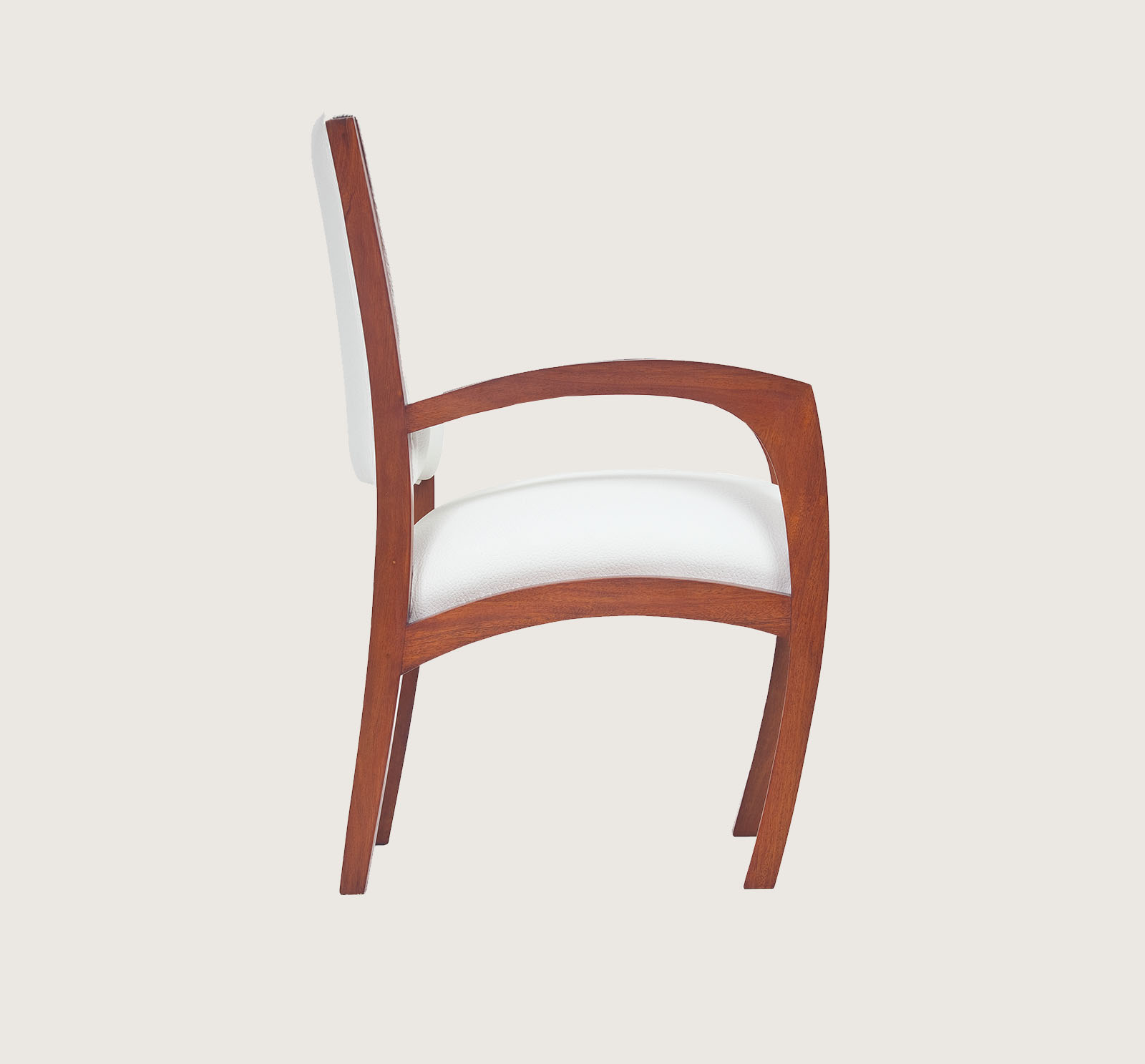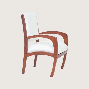 Its armrests and ergonomic cushioning offer both visual elegance and comfortable support for refined dining.
