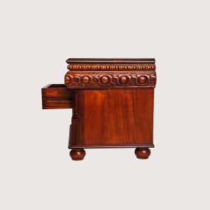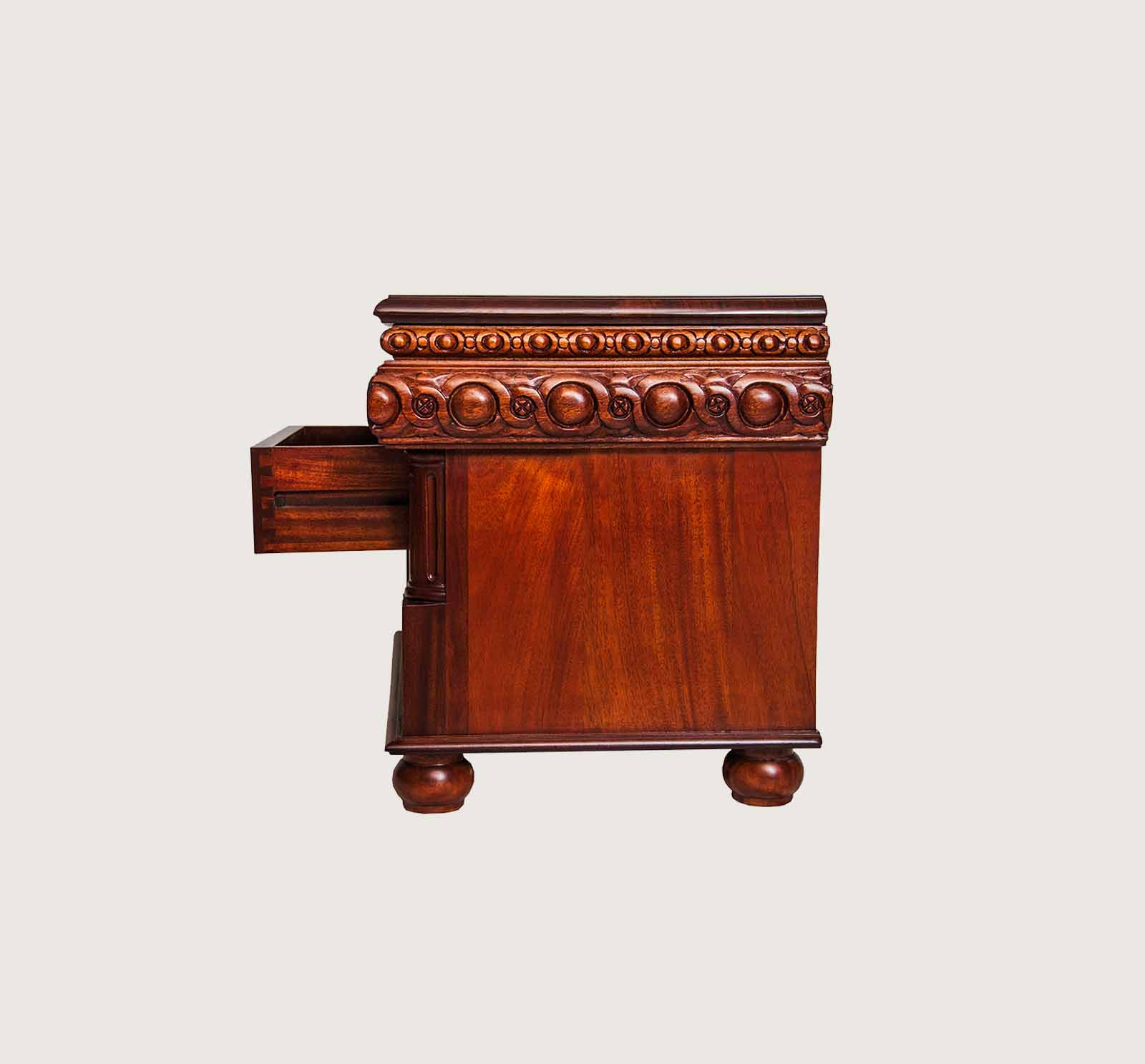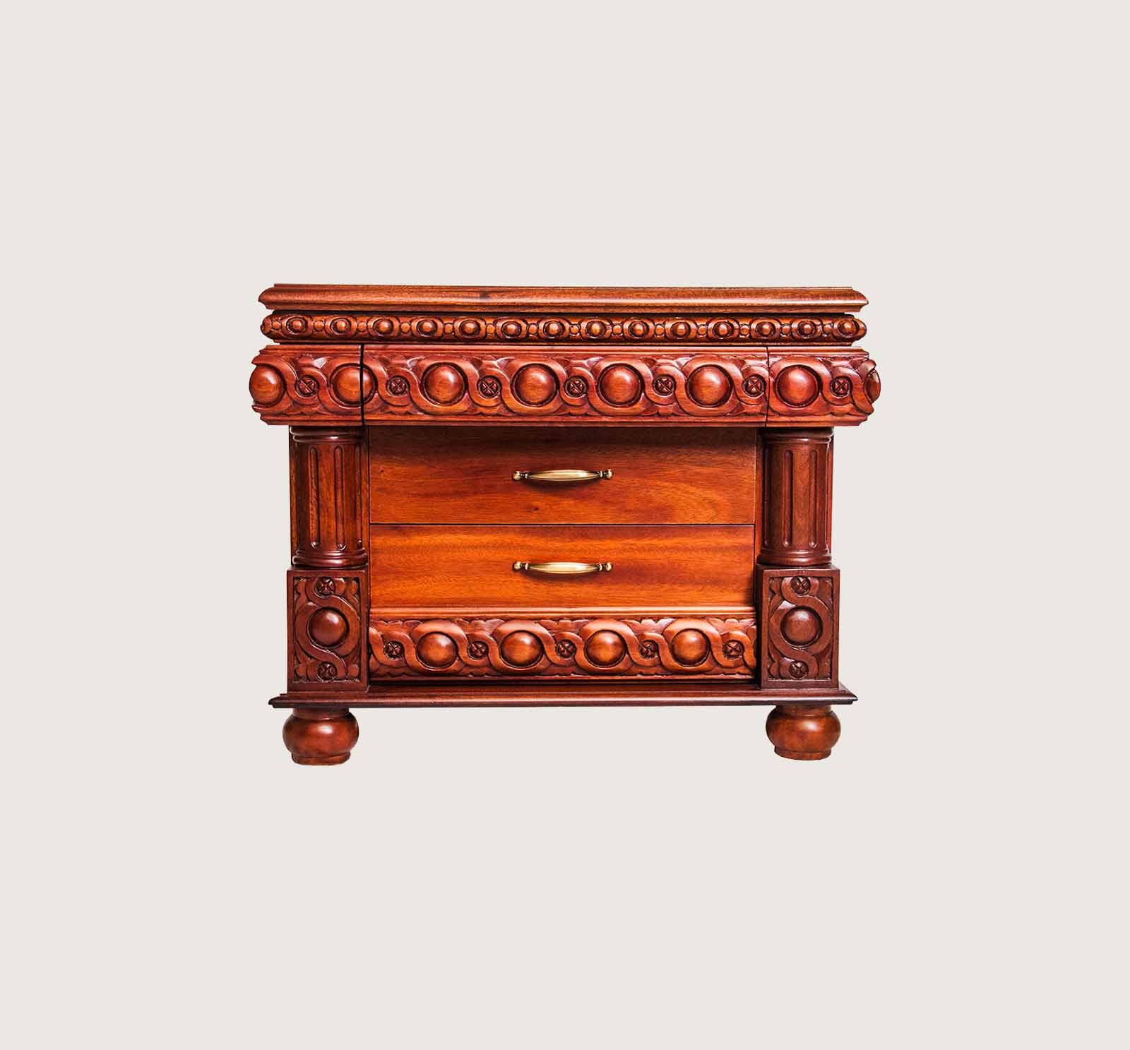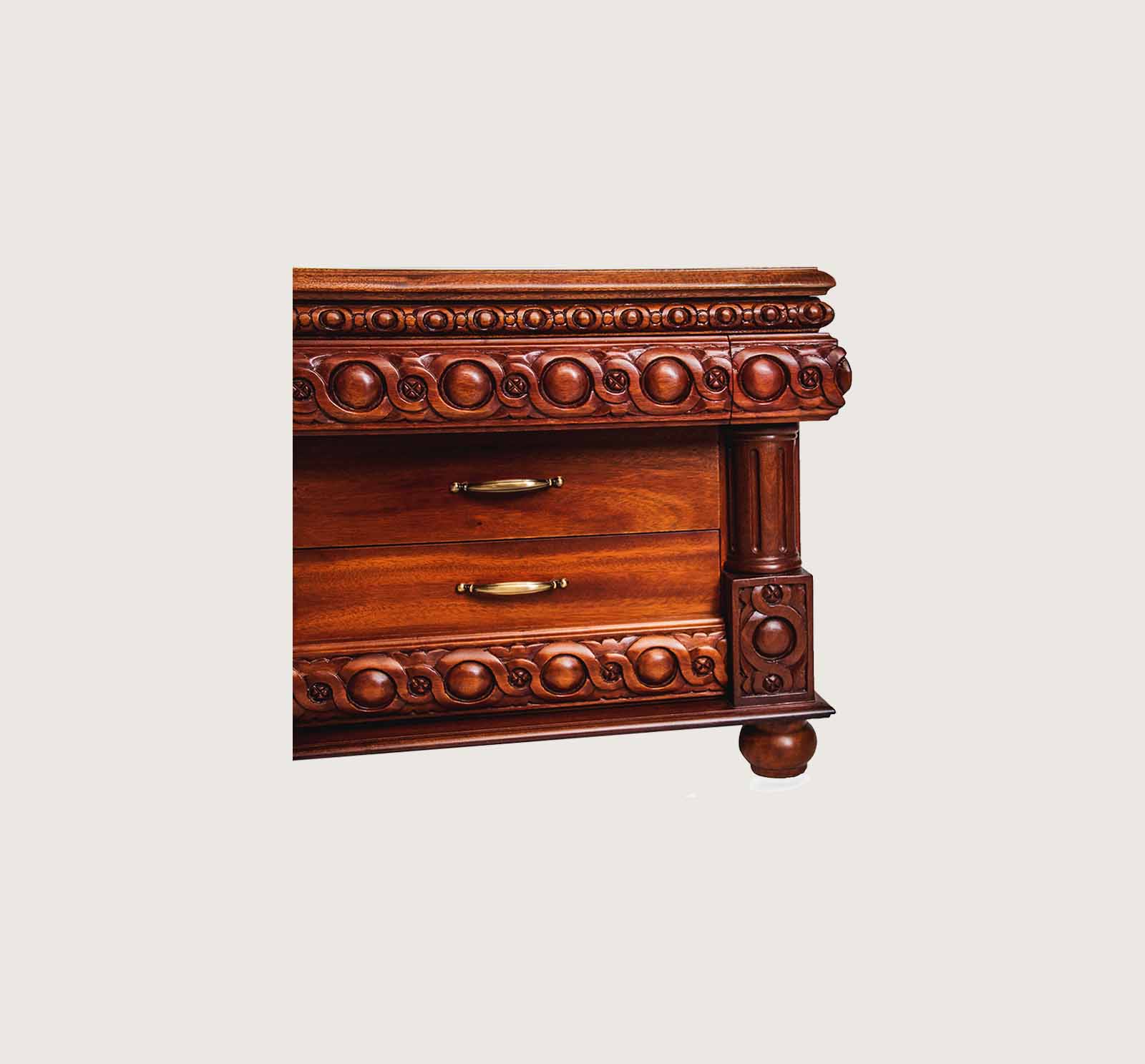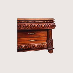The carvings on the Bellisimo bed is matched with its bedside. The Bellisimo bedside has three drawers and brass handles for here drawers. One highlight is the hidden top drawer amongst the