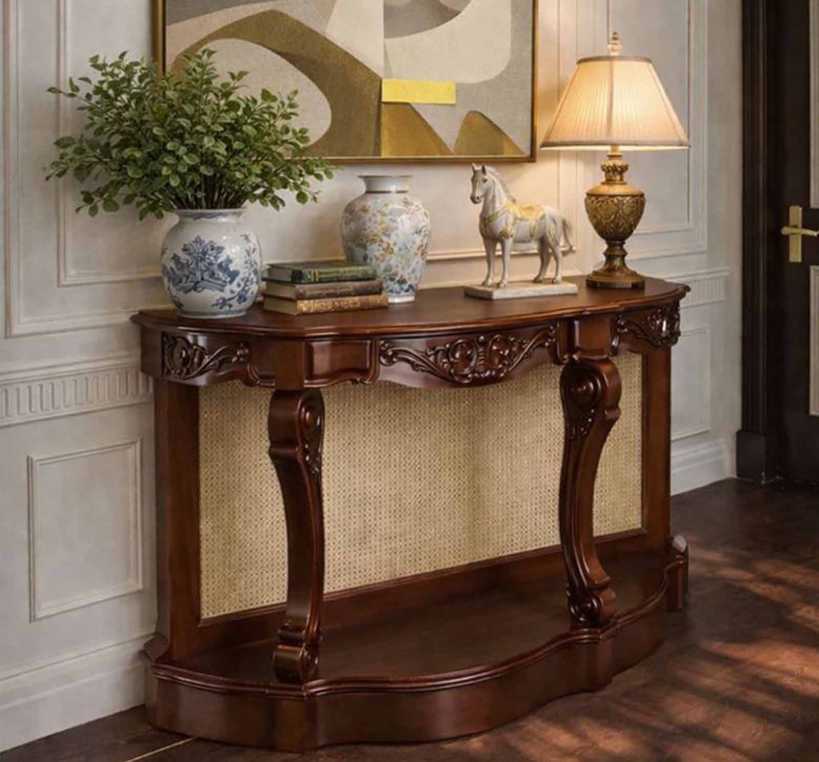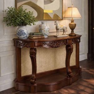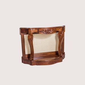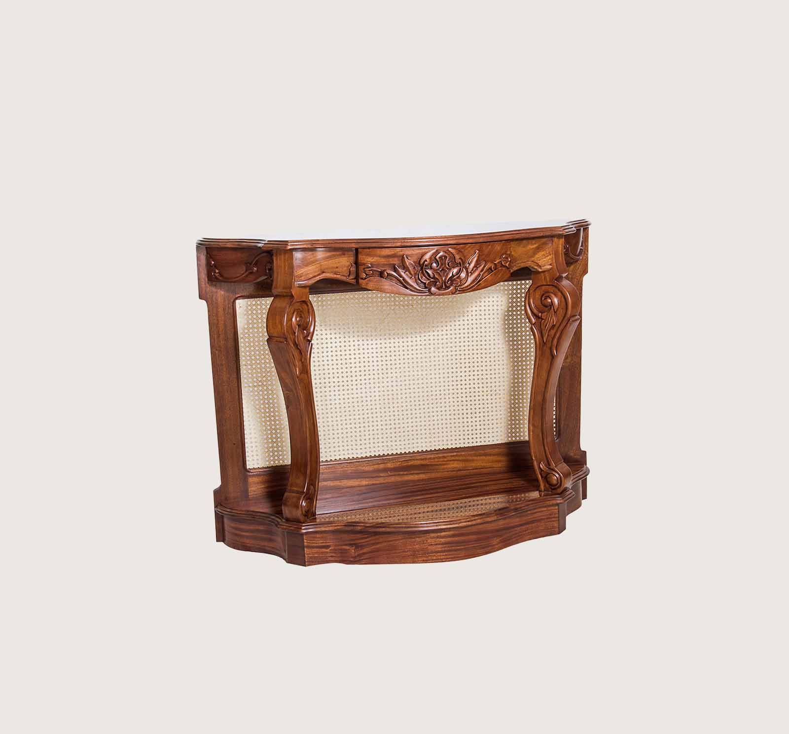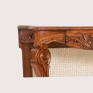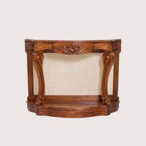 The Cane console featrures a curved silhouette, ornate hand-carved detailing, and a natural cane back panel. The design is supported by elegantly shaped legs with sculpted accents, finished in a warm wood tone that highlights the grain. A solid lower base adds stability while maintaining a light, refined appearance.