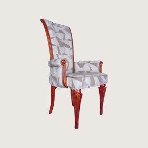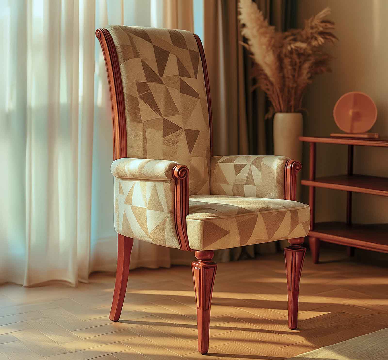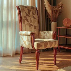 Upholstered in a distinctive fabric with geometric patterns, the chair introduces depth, rhythm, and visual intrigue to the dining experience.