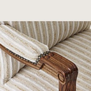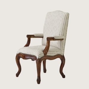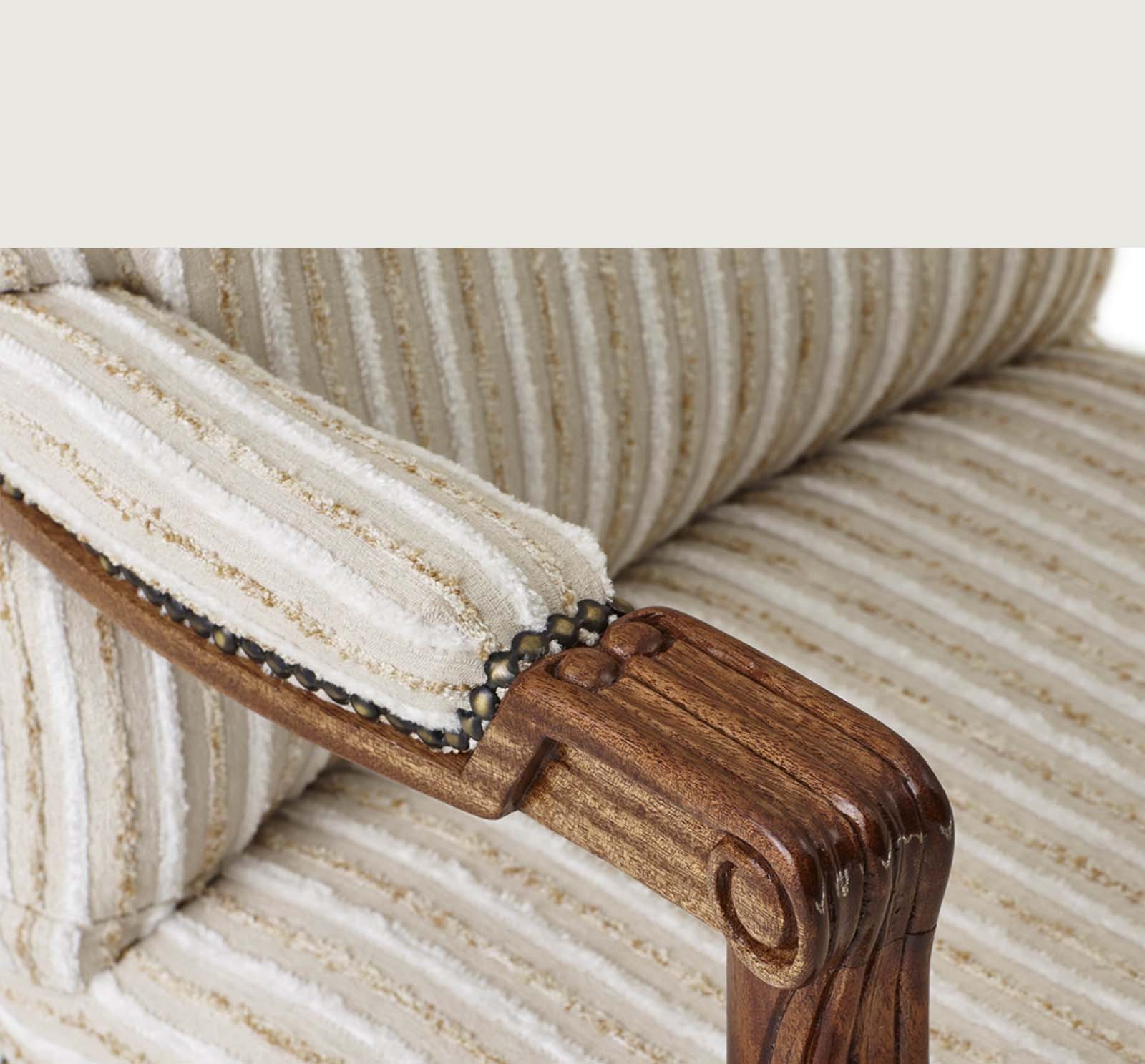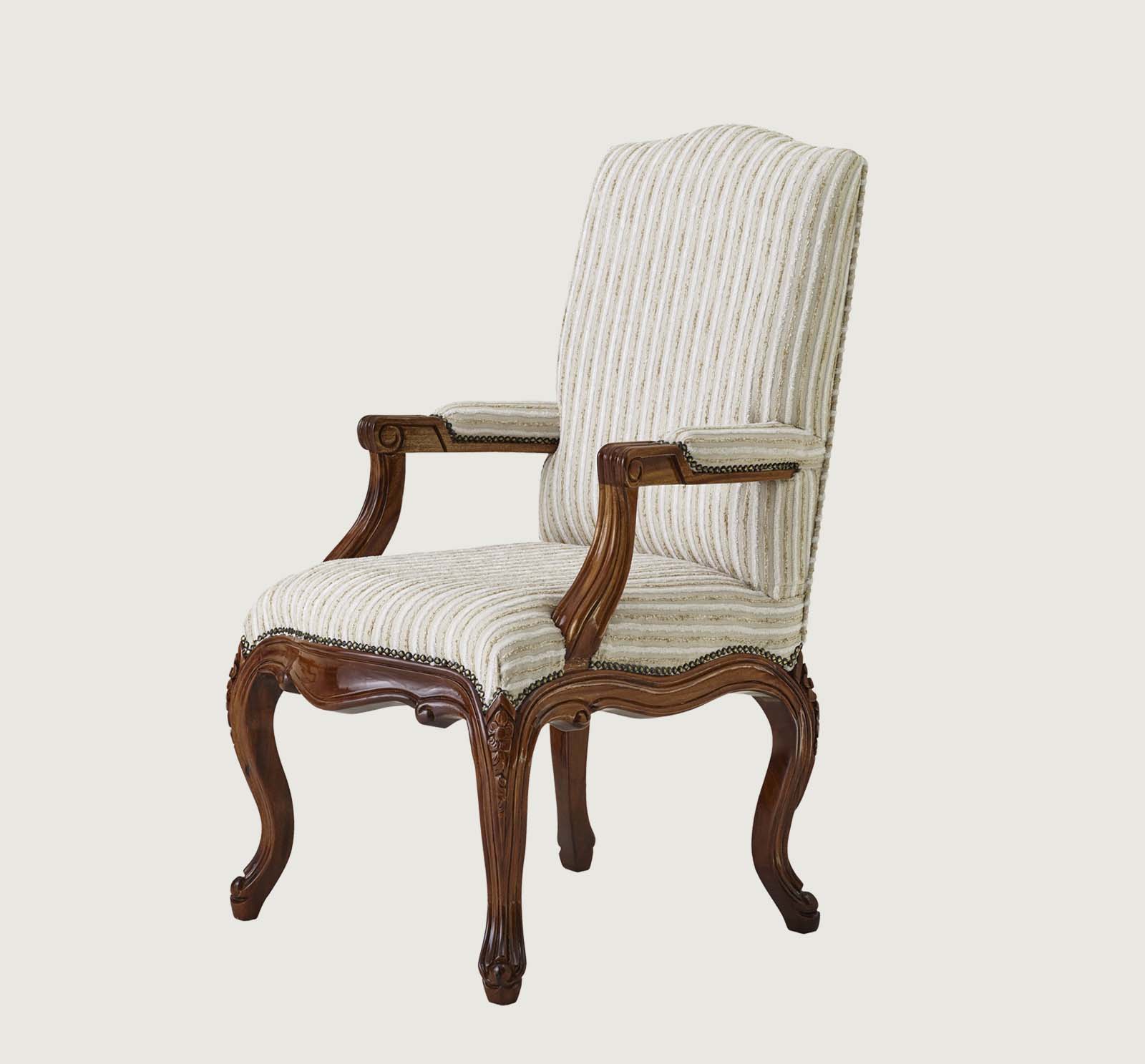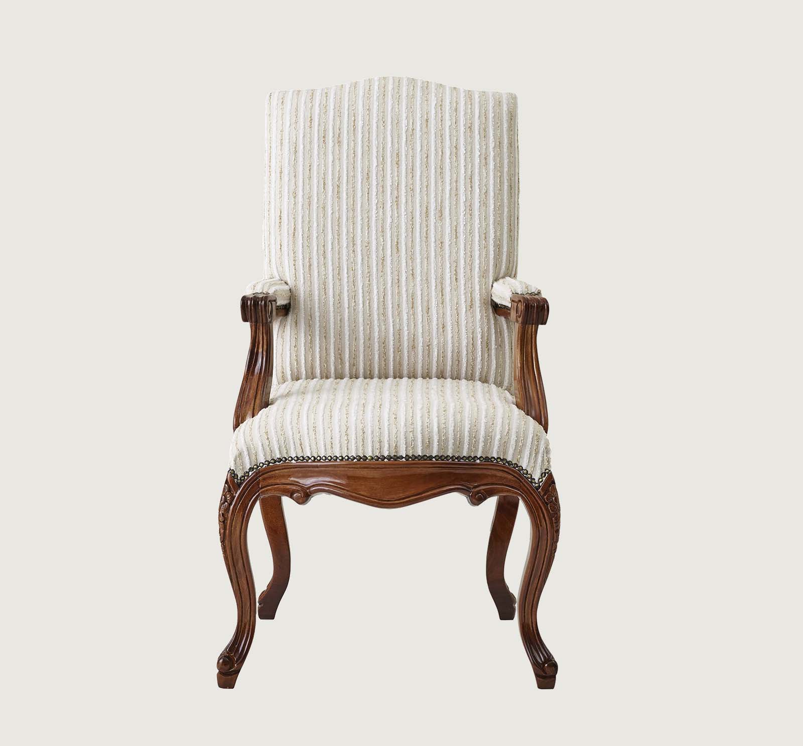 A timeless expression of elegance, this handcrafted chair embodies sophistication. Upholstered in a luxe striped fabric and accented with antique-style studs, it offers both comfort and couture.