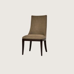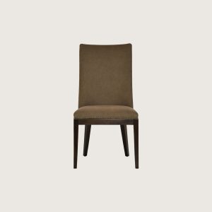 This Blair chair features a tall, gently curved upholstered back and a cushioned seat finished with refined nailhead trim. Set on solid wood tapered legs, its clean lines and tailored silhouette create a look of understated, modern elegance.