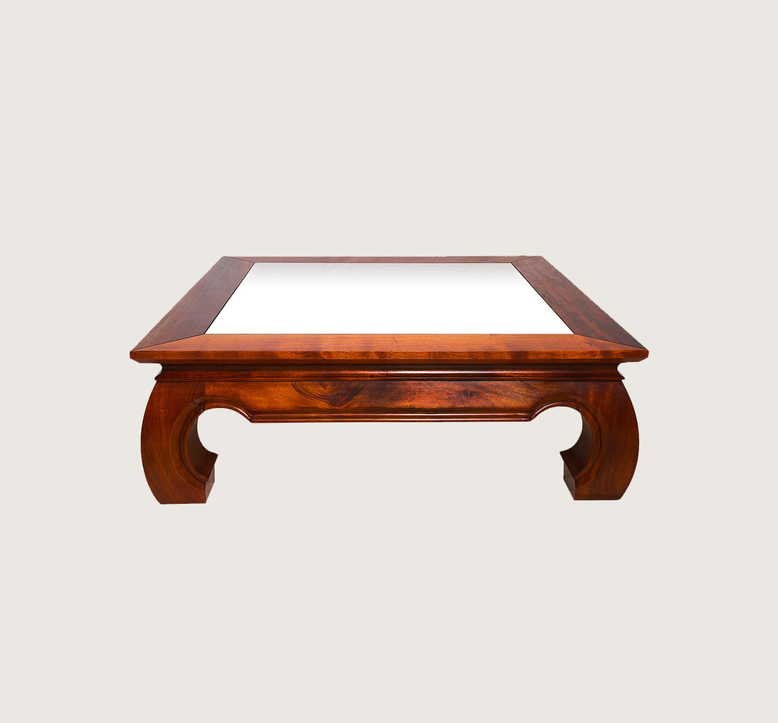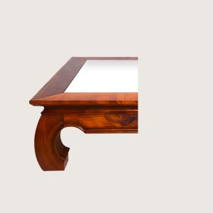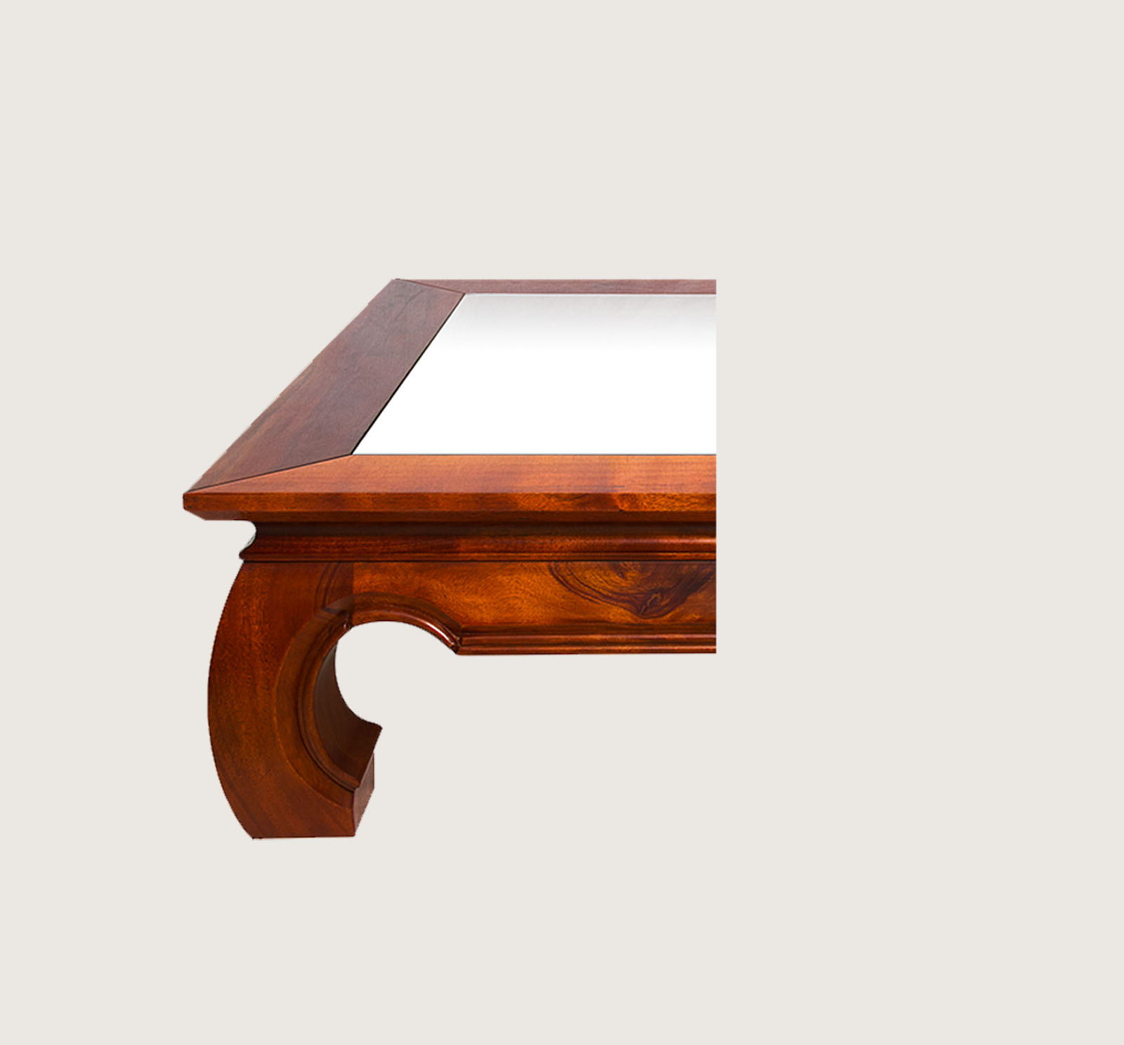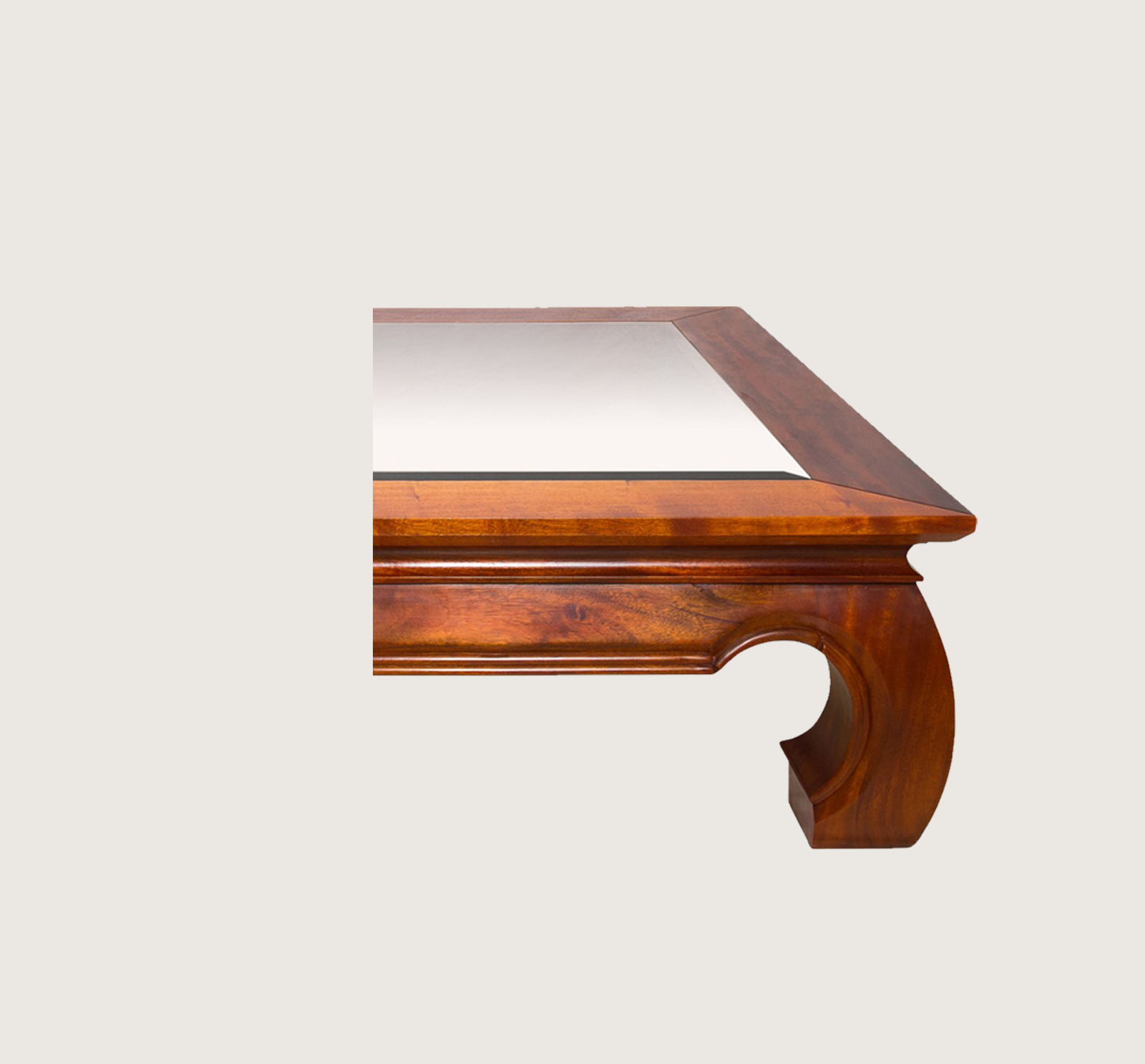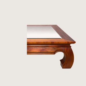 The beauty of this coffee table set is the bulk of the wood. The ShenBuhai is simply carved and made from mahogany with the top in the Panesar signature gloss finish, the bevelled glass top