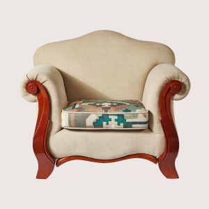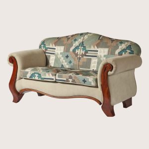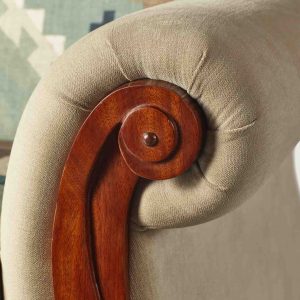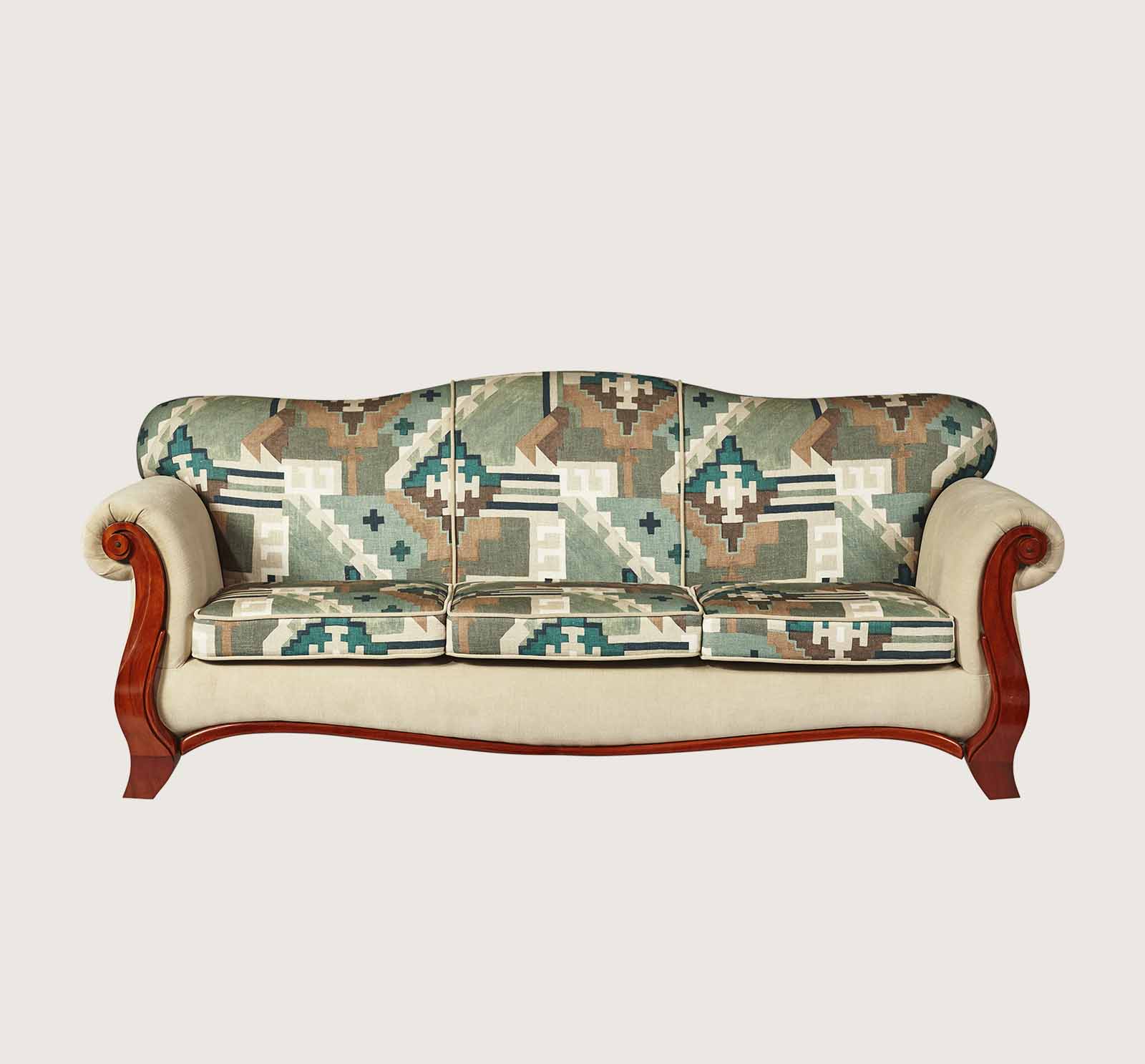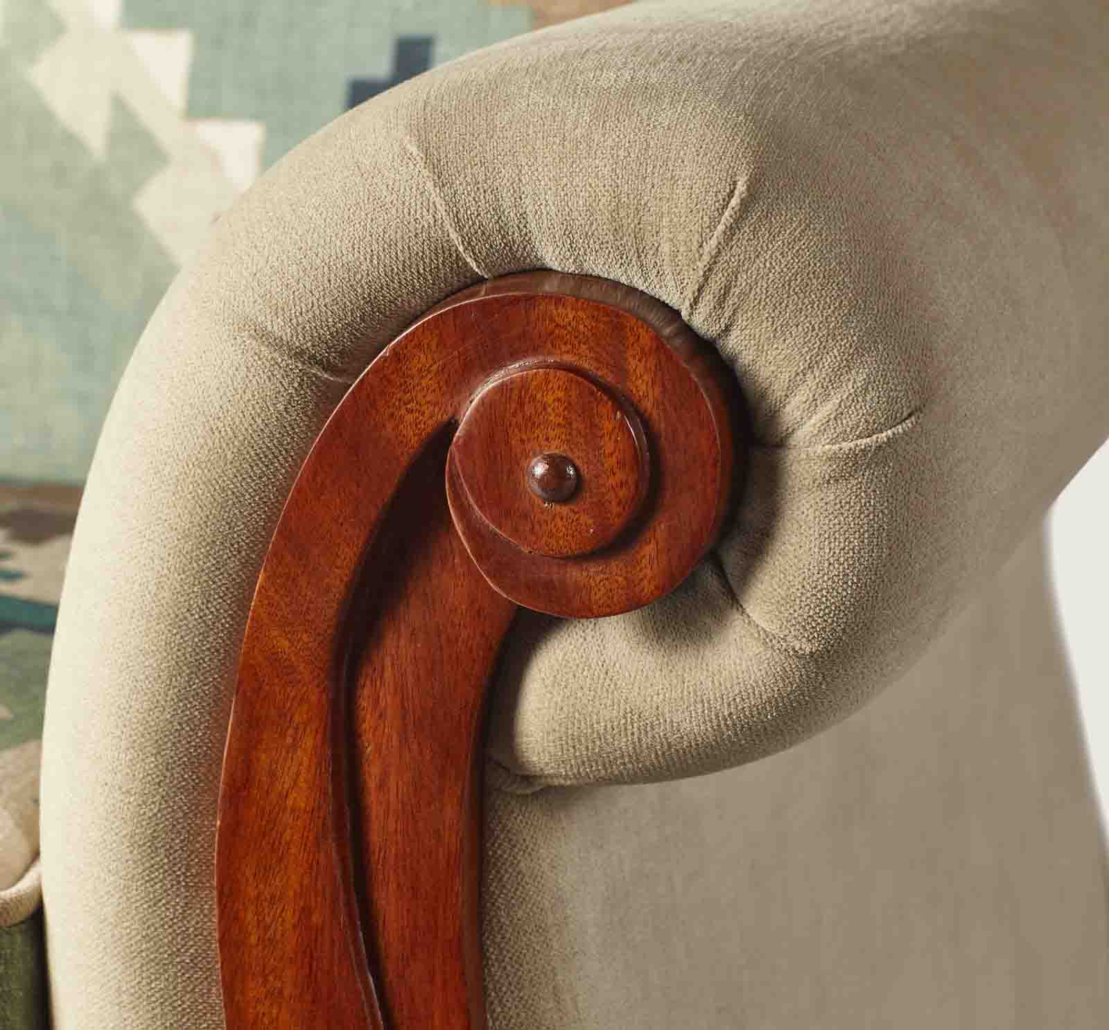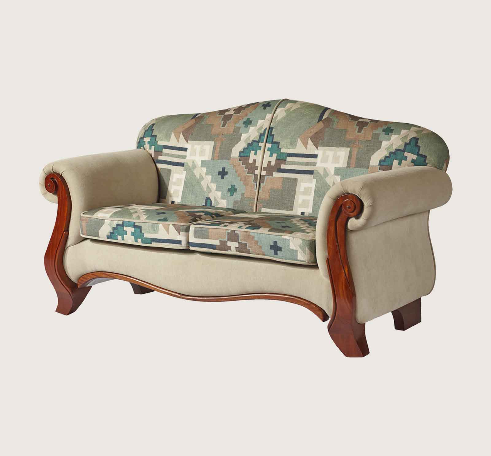 The Shinda sofa set features flowing curves and handcrafted legs that highlight natural wood grain.