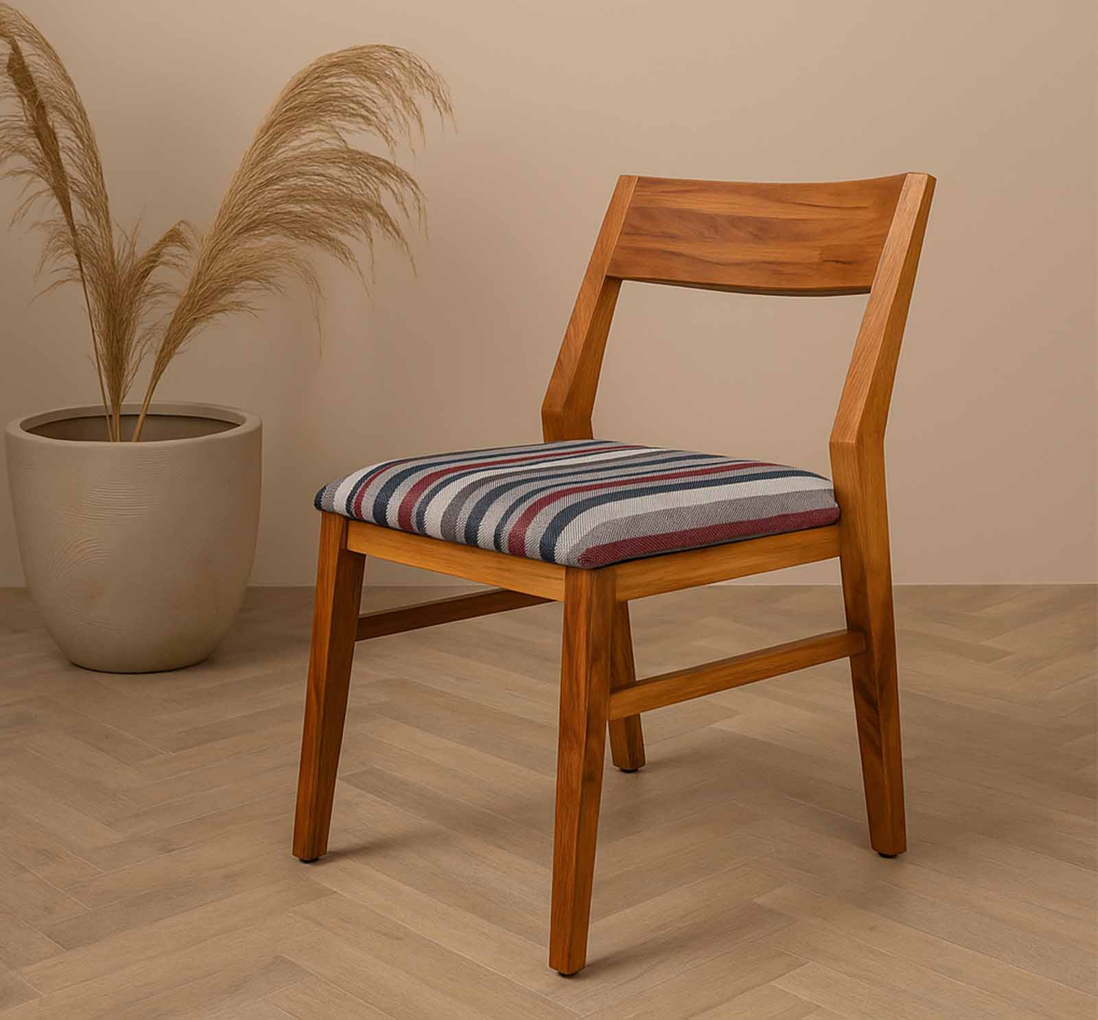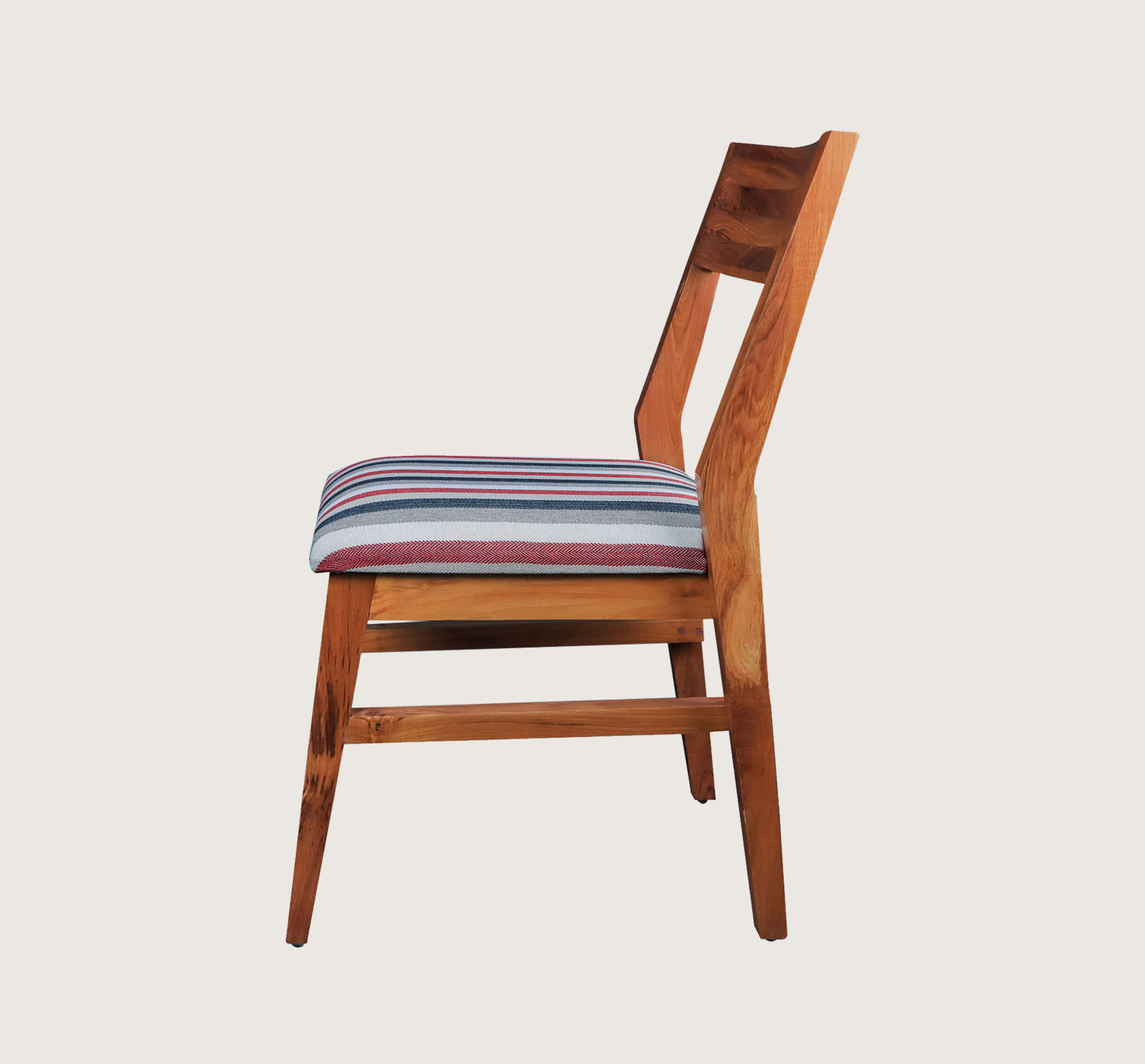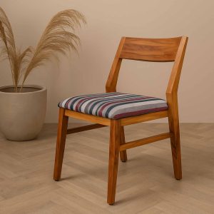 Crafted from solid teak, this dining chair embodies both strength and elegance. Its clean, angular frame reveals the natural richness and grain of this prized hardwood, while the upholstered seat in bold striped fabric introduces a modern contrast.
