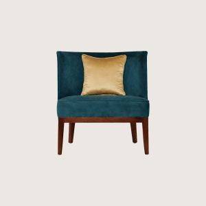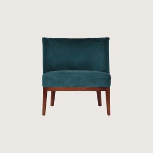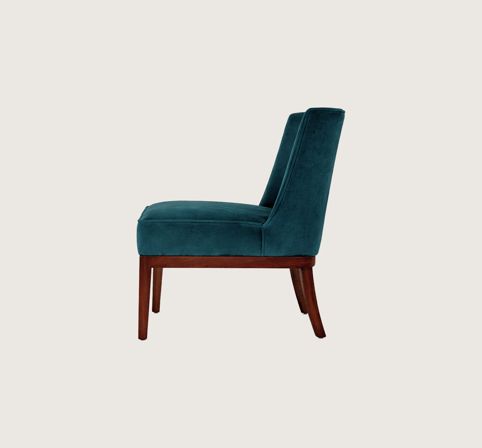 Defined by clean geometry and refined proportions, this chair features a gently curved backrest that wraps subtly for support. Upholstered in rich teal velvet, the smooth surface and tailored seams create a sleek, uninterrupted silhouette.