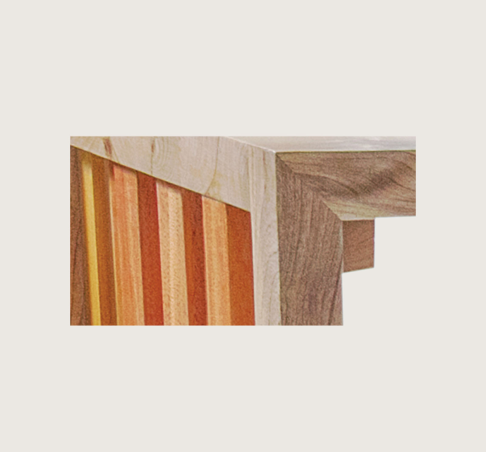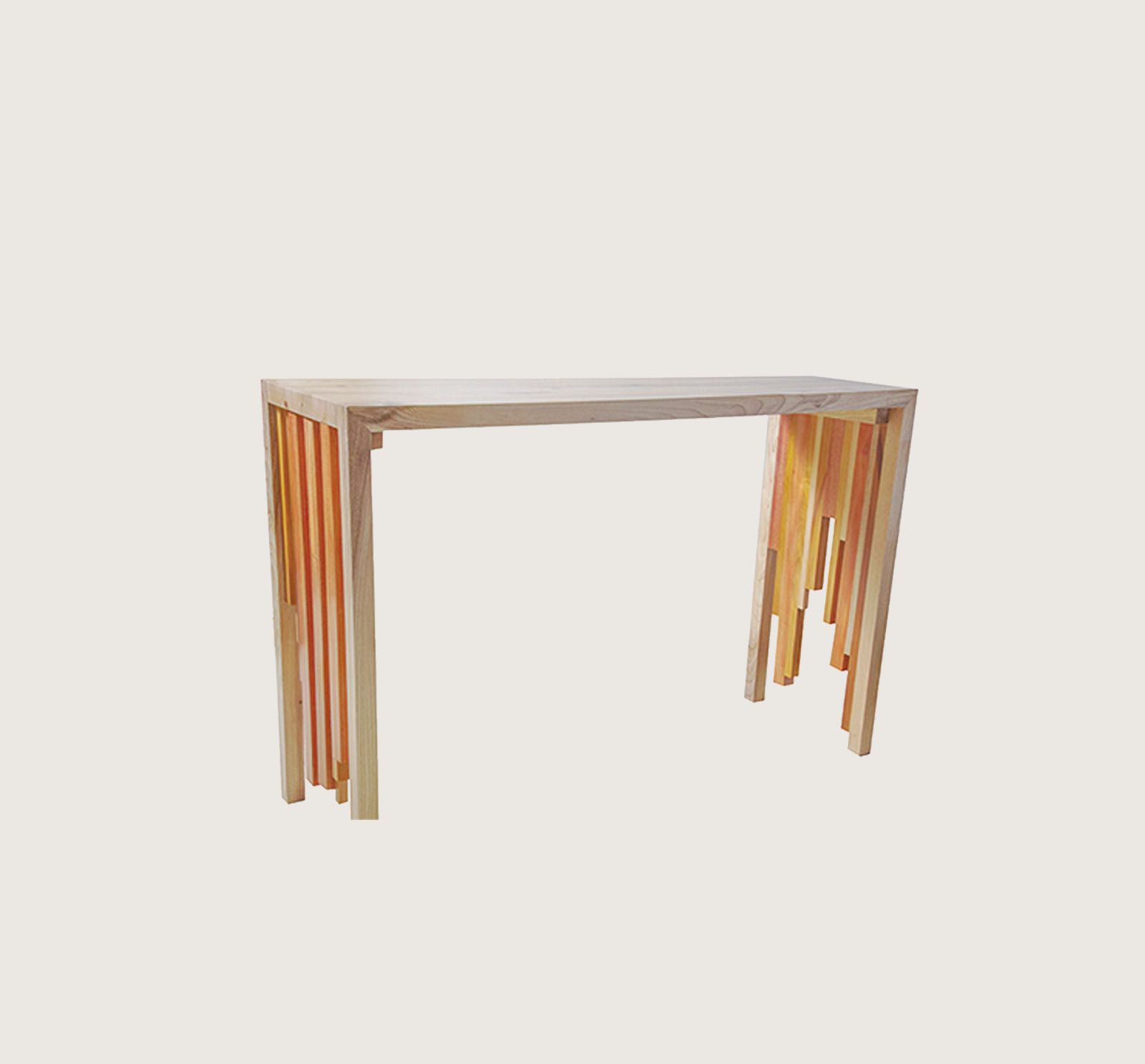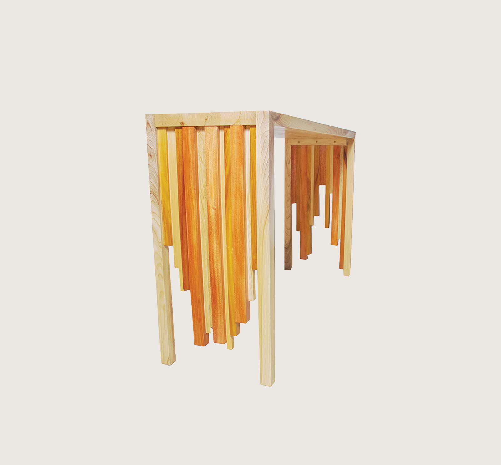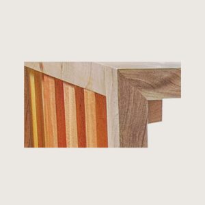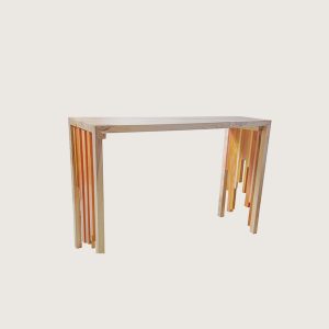 A spectacular piece displaying the rhythmic arrangement of different wood pieces to produce a trendy modern console. Mahogany, Mvuli and Meru oak wood were used here retaining their natural tones but with a gloss finish. This exquisite console, matched with its mirror, can be placed in the foyer, hallway or entry way of any space.