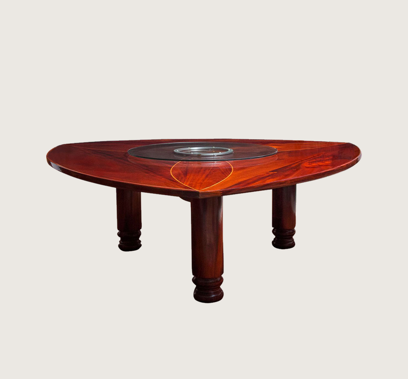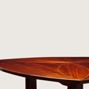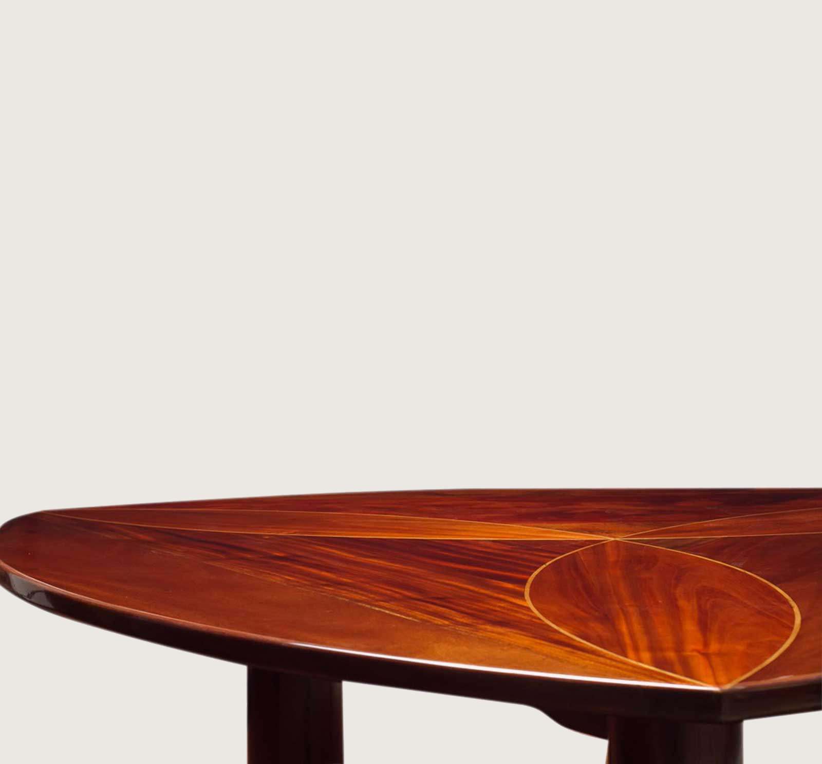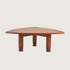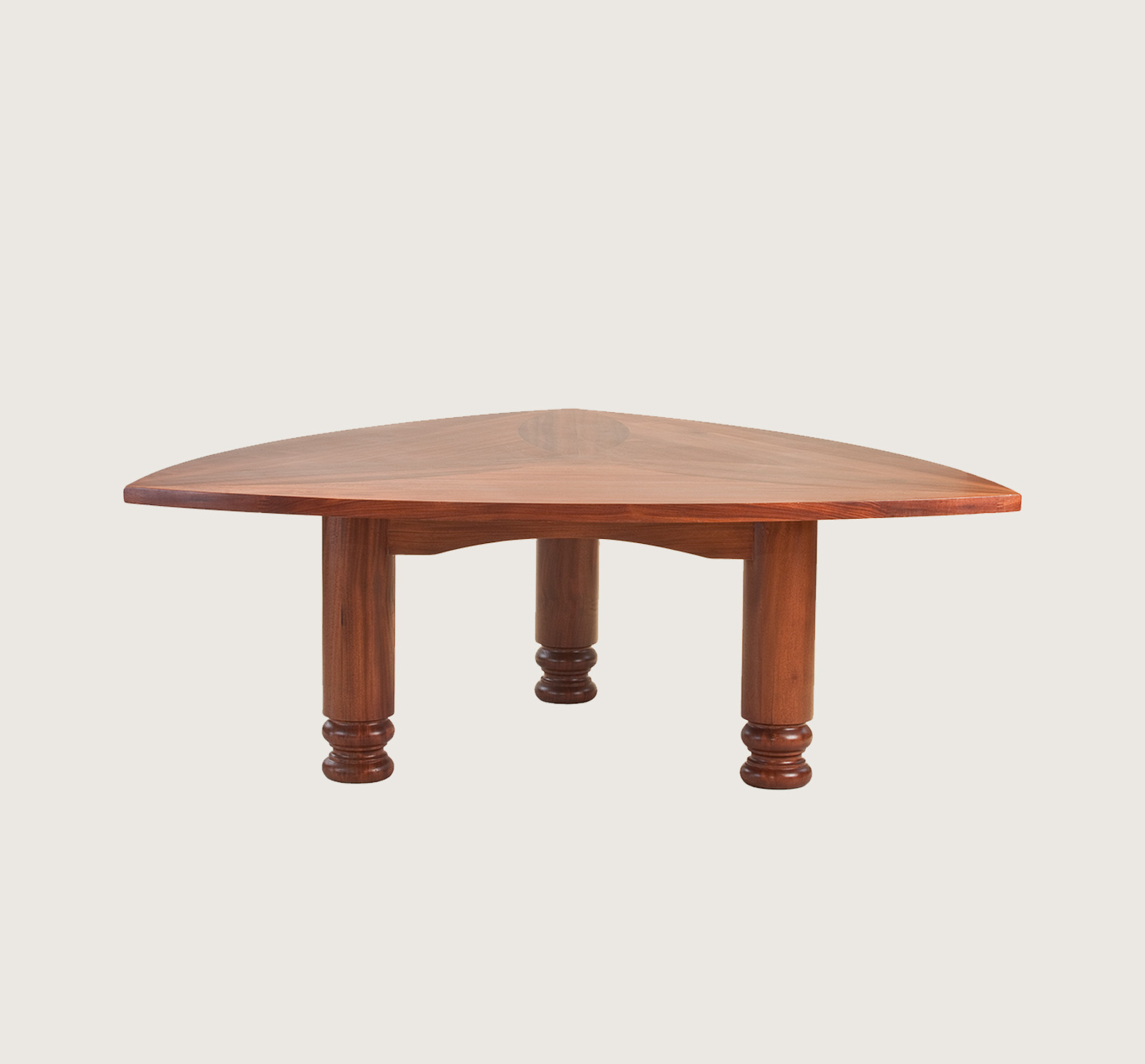 This innovative, unique dining table was an accidental design by Moni in 2013. Created for a client who wanted to be able to look into the garden together with her guests, the design came about with Moni experimenting with a compass, mathematically engineered to sit up to nine people. With a two inch top and legs to carry the weight, the seamless joinery on the Tripeidi accentuates the natural beauty of the wood and its grains. The inlay added at the leaf joints bring eye-catching detail to the unique structure.