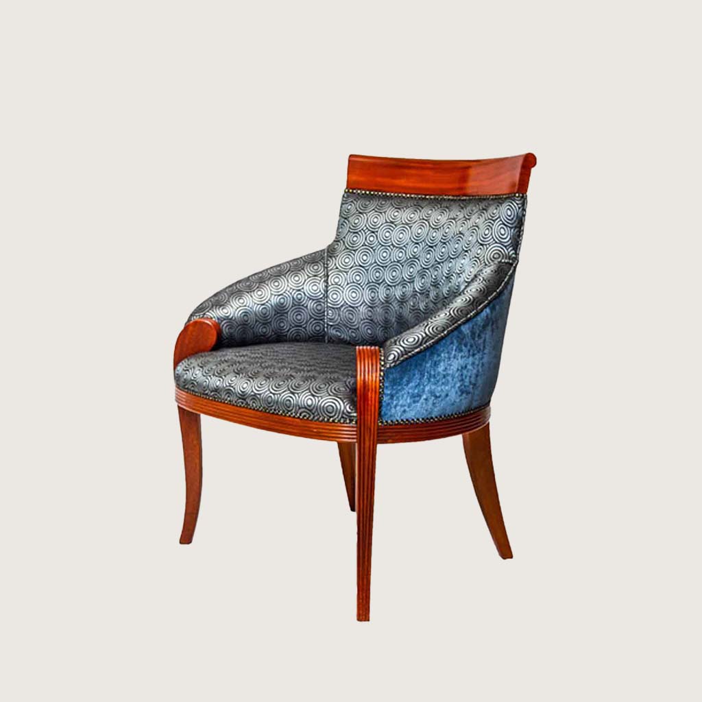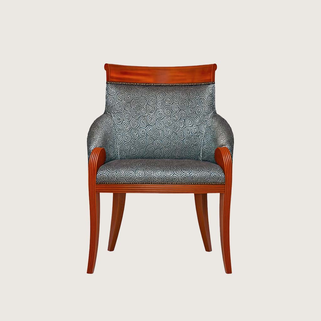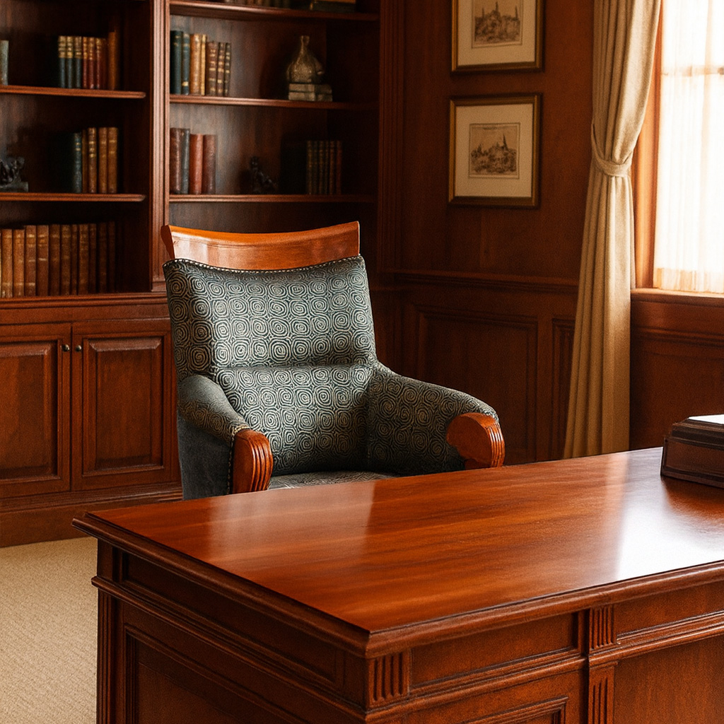 The Venice Executive Chair embodies the balance of authority and comfort. Handcrafted from polished hardwood, its sculpted arms and frame reveal Panesar’s mastery of timeless woodcraft. Upholstered in a distinctive patterned fabric, the chair offers both visual depth and tailored support, while the swivel base and adjustable height bring modern functionality to a classic form.