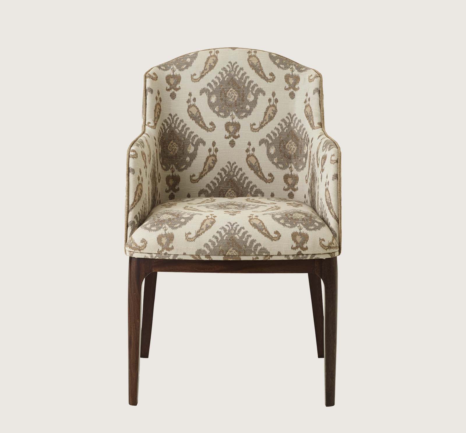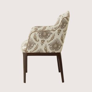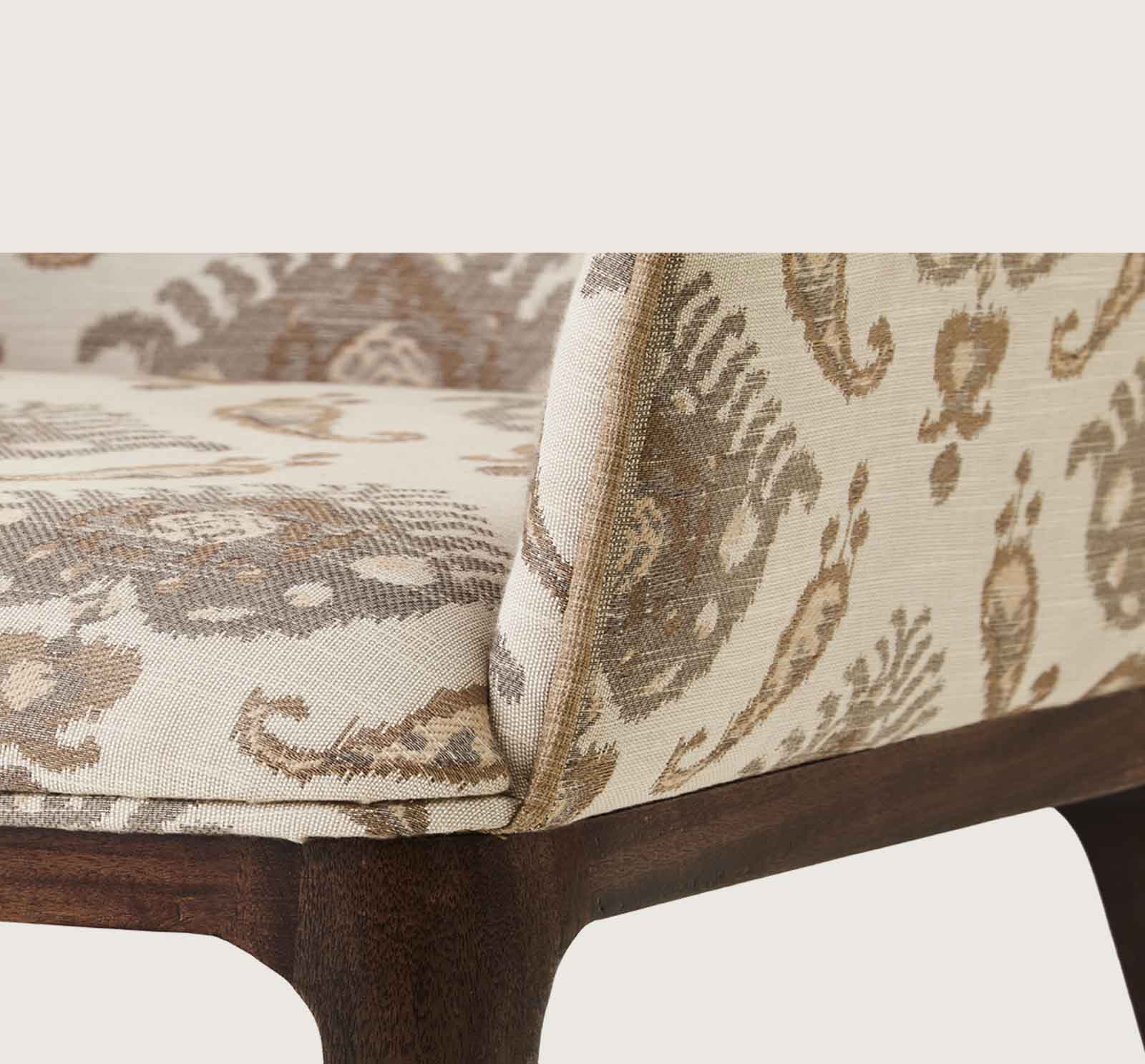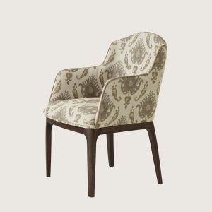 The sculpted frame and slender saber legs, crafted from solid mahogany, complete its graceful silhouette.